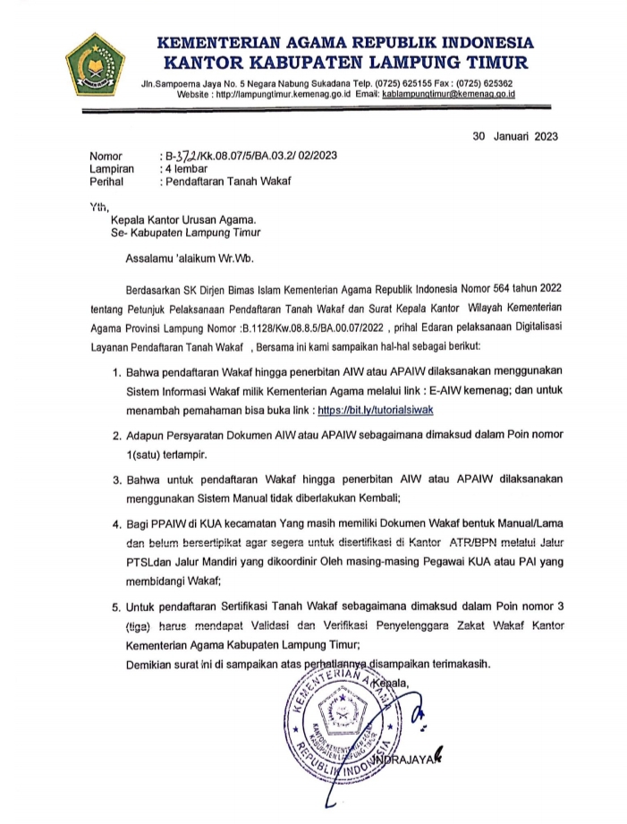 Berdasarkan SK Dirjen Binmas Islam Kementerian Agama RI nomor 564 tahun 2022 tentang Petunjuk Pelaksanaan Pendaftaran Tanah Wakaf dan surat Kepala Kantor Wilayah Kementerian Agama Provinsi Lampung Nomor : B. 1128/Kw.08.8.5/BA.00.07/2022, perihal edaran pelaksanaan Digitalisasi Layanan Pendaftaran Tanah Wakaf, bersama ini kami sampaikan hal-hal sebagai berikut: