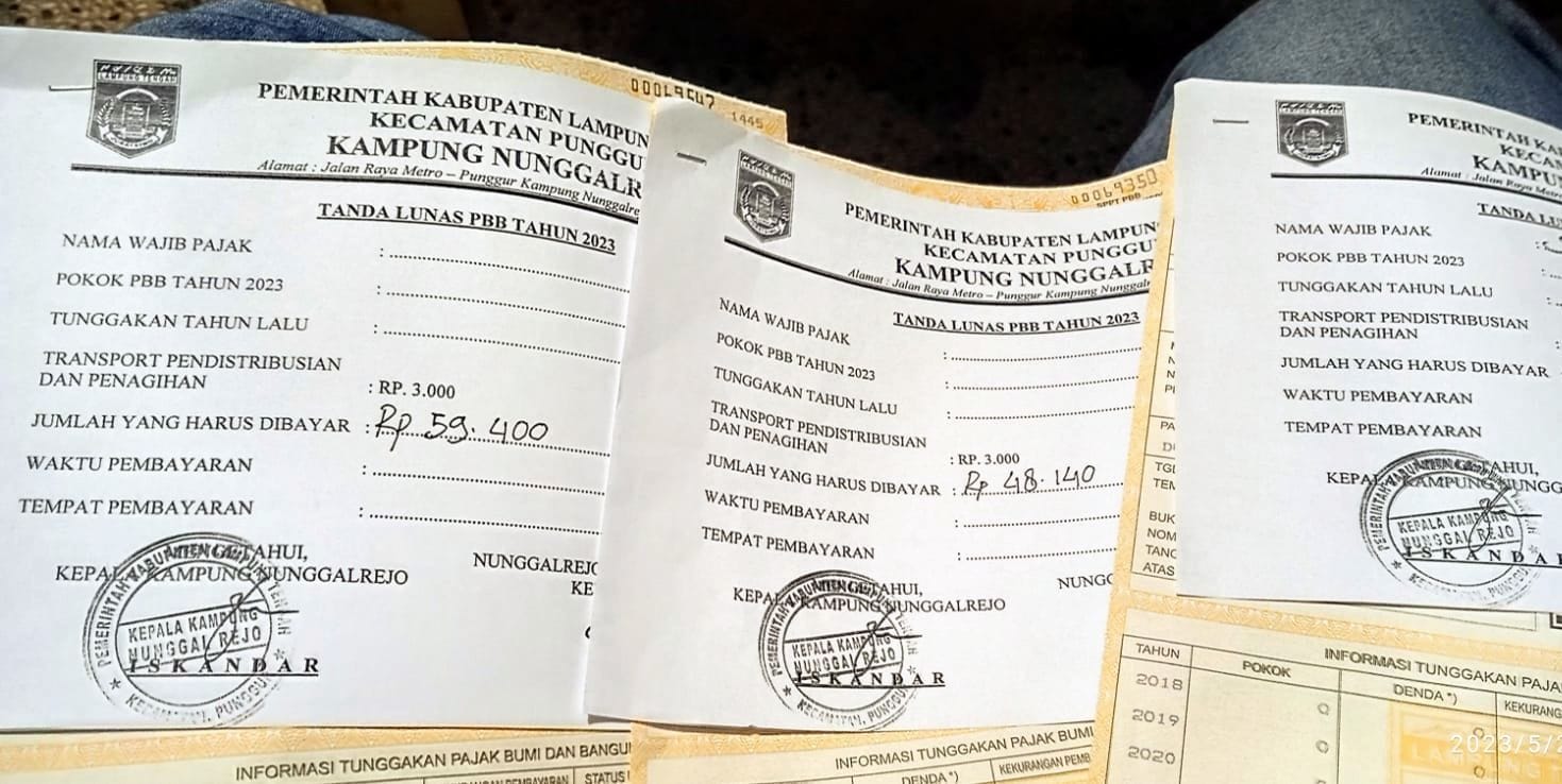 PUNGGUR – Warga Kampung Nunggalrejo, Kecamatan Punggur, Lampung Tengah (Lamteng), mengeluhkan biaya transportasi penarikan Pajak Bumi dan Bangunan (PBB) yang dipatok Rp.3000 oleh aparatur Kampung Nunggalrejo.