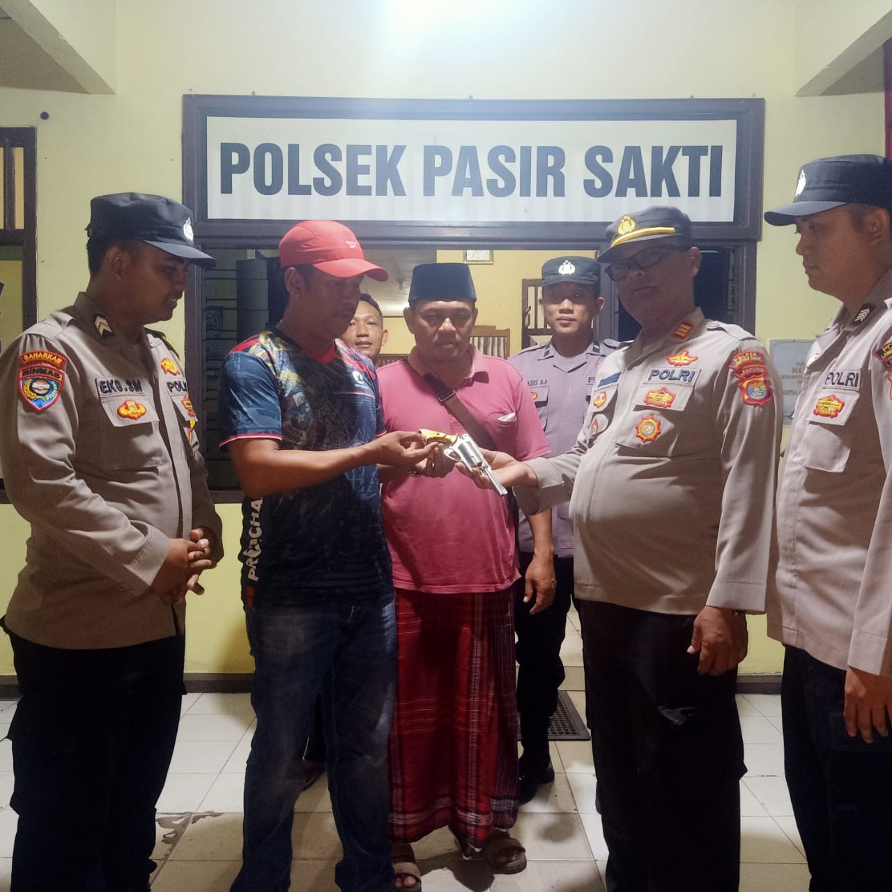 Senpi bergagang berwarna emas dan memiliki 5 silinder tersebut diserahkan setelah Anggota Tekab 308 Polsek Pasir Sakti bersama-sama Bhabinkamtibmas memberikan himbauan Kamtibmas kepada masyarakat.