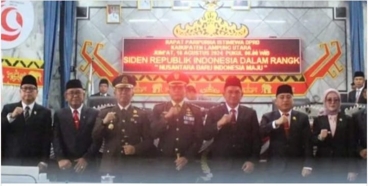 Metrodeadline, Lampung Utara – Dewan perwakilan Rakyat Daerah (DPRD) kabupaten Lampung Utara menggelar rapat paripurna istimewa dengan agenda mendengarkan pidato kenegaraan oleh presiden Joko Widodo. Rapat Paripurna tersebut dilaksanakan sehubungan dengan hari ulang tahun Republik Indonesia yang ke-79 tahun. Hadir dalam kegiatan tersebut, Pj. Bupati Lampung Utara, H. Aswarodi beserta jajaran dan forkopimda setempat.