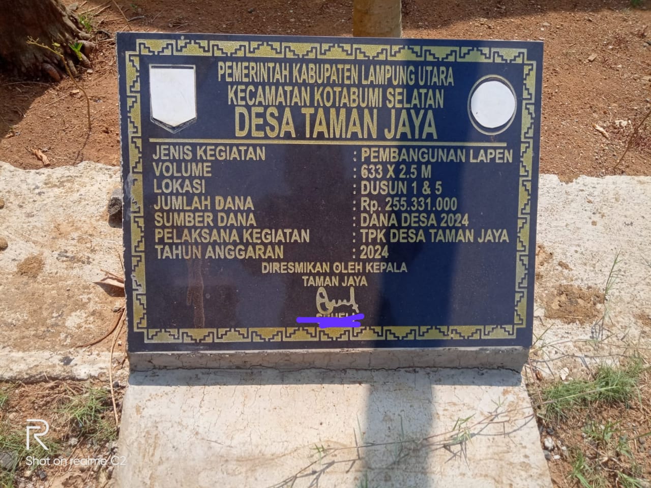 Metrodeadline, Lampung Utara – Pembangunan jalan lapen yang merupakan salah satu kegiatan penyerapan Dana Desa di Desa Taman Jaya, Kecamatan Kotabumi Selatan tahun anggaran 2024 disoal Lembaga Swadaya Masyarakat (LSM) Gerakan Masyarakat Bawah Indonesia (GMBI) Distrik Lampung Utara (Lampura).