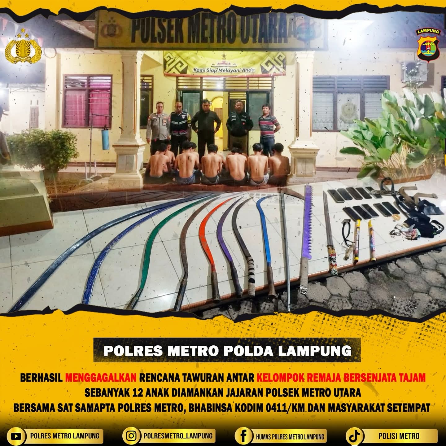 Polres Metro bersama Polsek Metro Utara, Bhabinsa, dan warga berhasil menggagalkan rencana tawuran remaja di Jalan Akasia, Metro Utara, Jumat malam (26/9/2025). Sebanyak 12 anak diamankan saat pesta minuman tuak, dengan barang bukti 7 celurit, 2 parang, gergaji, tongkat tajam, ketapel, kembang api, dan 10 handphone.
