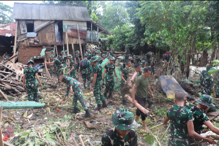 “Di lokasi ini, personel bersama warga membersihkan reruntuhan rumah terdampak, mengangkut sampah di sekitar permukiman, serta mengumpulkan batu kali untuk pembangunan kembali tembok penahan air yang roboh,” ungkapnya.