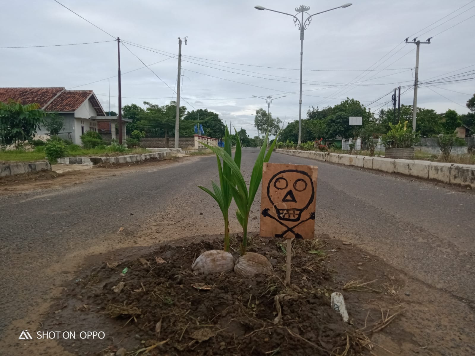 Selain menanam 2 tunas kelapa di Jalan Protokol Ibukota Kabupaten Lampung Timur, Sarkawi juga memasang gambar tengkorak di papan triplek pertanda bahaya yang dapat dilihat oleh setiap pengendara saat melintas dari arah Kota Metro.