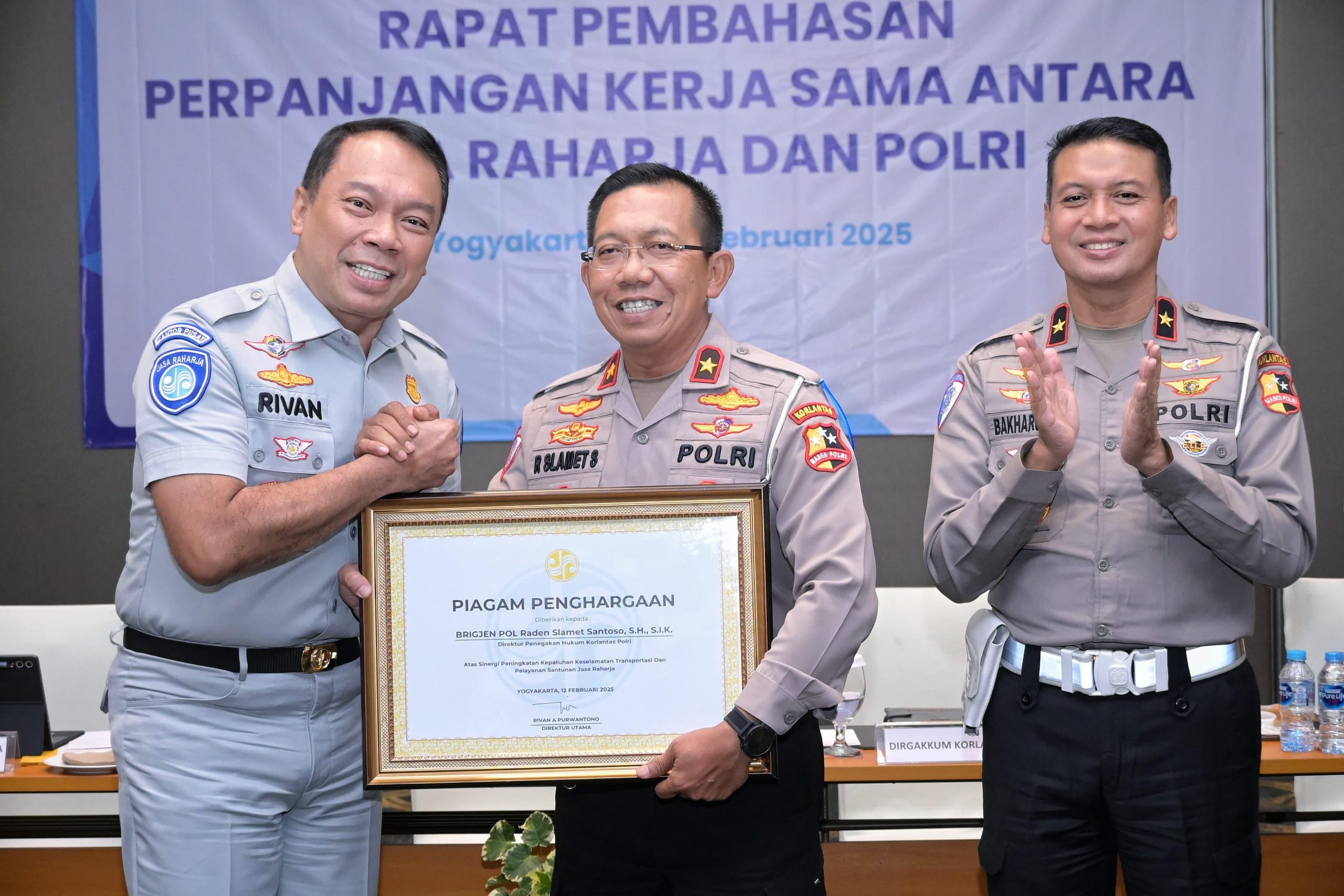 Utama PT Jasa Raharja Rivan A. Purwantono bersama Direktur Operasional Dewi Aryani Suzana dan Direktur Kepatuhan dan Manajemen Risiko Harwan Muldidarmawan, sedangkan POLRI menghadirkan beberapa orang perwakilan dari berbagai divisi terkait, termasuk Brigjen Pol. Akhmad Yusep Gunawan, S.H, S.I.K., M.H., M.HAN. (Karokermaluhkum Divkum POLRI), Brigjen Pol. Raden Slamet