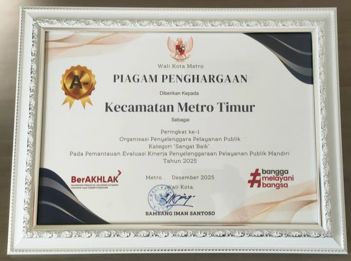 Metro, Metrodeadline.com – Kecamatan Metro Timur mendapatkan Peringkat 1 Organisasi Penyelenggara Publik Katagori “Sangat Baik” pada Pemantauan Evaluasi Kinerja Penyelenggara Pelayanan Publik Mandiri Tahun 2025, Senin (29/12/2025)
